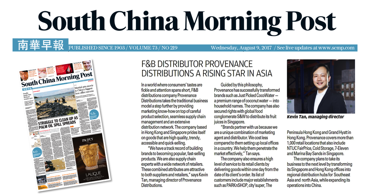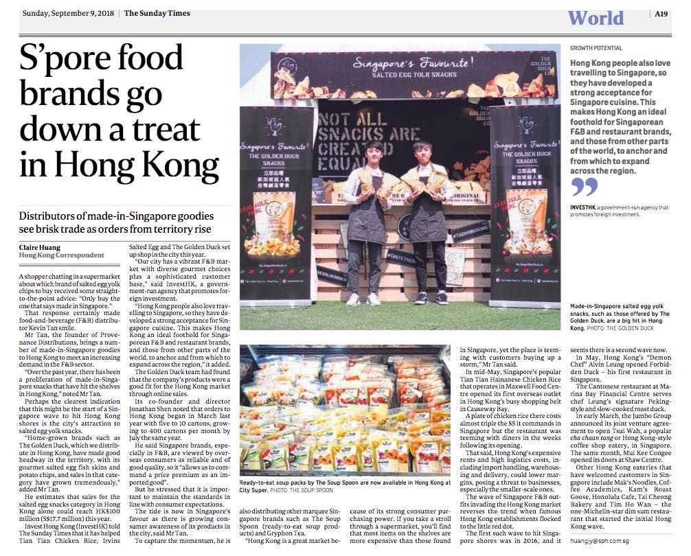 Provenance Distributions & the Singaporean brands they distribute in Hong Kong — The Golden Duck, The Soup Spoon and Gryphon Tea — were featured in a half-page article on The Straits Times World section (9th September 2018) on Singaporean brands making waves in Hong Kong. Provenance’s Managing Director Kevin Tan commented on the success...